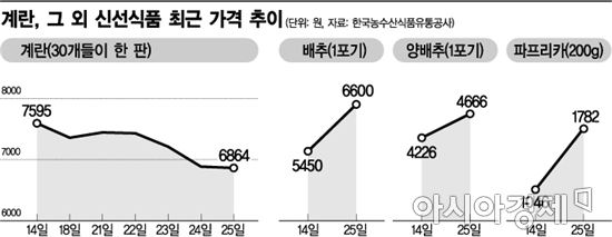 [아시아경제 오종탁 기자] '에그포비아(계란과 공포증의 합성어)' 속 계란값이 하락세를 거듭하고 있지만 그 외 채소 등 신선식품 가격은 여전히 고공행진 중이다. 대형마트 3사가 계란 30개들이 한 판 가격을 깎고 또 깎아도 밥상물가 하락에는 별 도움이 되지 않는다.