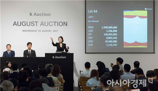 [아시아경제 김세영 기자] 케이옥션 8월 경매가 30일 오후 낙찰률 75%, 낙찰총액 74억 원으로 마무리됐다. 경매 최고가 작품은 김환기의 ‘Sounding 3-VIII-68 #32’으로 15억원을 기록했다.