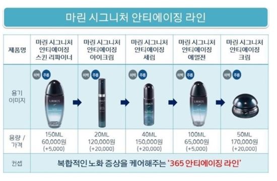 새롭게 출시되는 마린 시그니처 안티에이징 라인 가격은 기존 안티에이징 라인인 OA라인보다 최대 20% 인상된 수준이다. 스킨리파이너(150㎖)는 6만원, 아이크림(20㎖)은 12만원, 세럼(40㎖)은 15만원, 에멀젼(100㎖)은 6만5000원, 크림(50㎖)은 17만원이다.