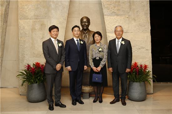 ▲4일 서울 삼성동 아이파크타워 포니정홀에서 열린 제11회 포니정 혁신상 시상식에 참석한 (왼쪽부터) 정몽규 현대산업개발 회장과 수상자 이국종 아주대병원 교수, 고 정세영 현대산업개발 명예회장의 부인 박영자 여사, 김철수 포니정재단 이사장이 기념촬영을 하고 있다.