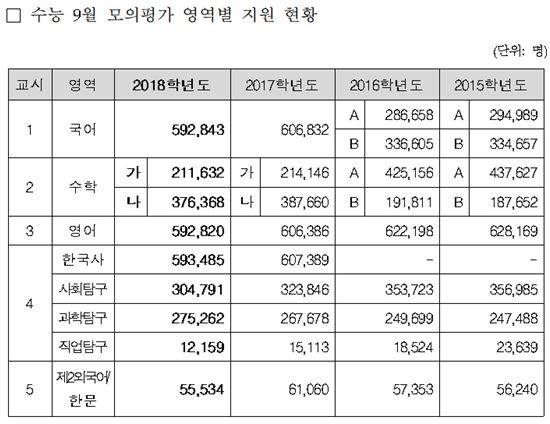 영역별 지원자는 국어 59만2843명, 수학 가형 21만1632명, 수학 나형 37만6368명, 영어 59만2820명, 한국사 59만3485명, 사회탐구 30만4791명, 과학탐구 27만5262명, 직업탐구 1만2159명이다. 제2외국어와 한문 영역은 5만5534명이다.