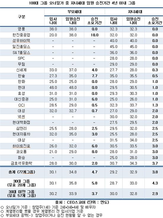 임원 승진 기간은 부모세대보다 자녀세대로 올수록 짧아지고 있다. 재계 1~2세대가 주로 해당되는 부모세대(공정거래위원회 동일인 기준)는 평균 30.1세에 입사해 4.7년 후 임원으로 승진했지만, 3~4세대로 분류되는 자녀세대는 29.2세에 입사해 3.8년 만에 임원을 달았다.