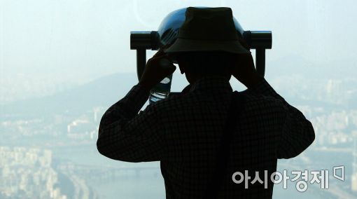 [아시아경제 문호남 기자] 미세먼지 농도가 한때 '나쁨' 수준을 보인 8일 서울 송파구 롯데월드타워에서 한 시민이 흐린 도심을 바라보고 있다.