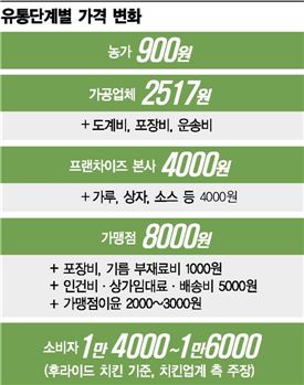 생닭이 치킨이 되기까지 '농가→가공ㆍ유통업자→프랜차이즈본부→가맹점'의 순서를 거친다. 프랜차이즈업체가 하림이나 마니커와 같은 육가공업체로부터 닭을 공급받으면, 이후 업체는 염지한 뒤 진공포장해서 가맹점에 넘긴다. 이때 원가가 4000원~6000원선. 가맹점에서 튀기는 비용과 인건비, 임대료 등을 모두 계산한 후 소비자에 공급하면 최소 1만4000원~1만6000원에 이른다는 것. 결국 가맹점이 갖는 마진은 2000원~3000원선이다.