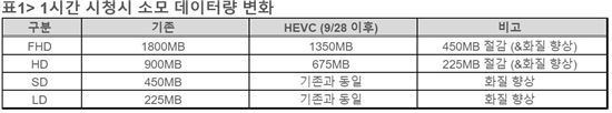 SK텔레콤은 저화질 SD와 LD급 영상의 경우 기존 데이터 전송률을 유지하며 화질을 대폭 개선하는 방향으로 HEVC를 적용했다.