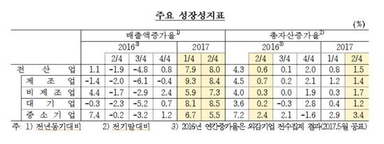 이후 지난해 4분기에 0.8%로 반등했고 올해 1분기(7.9%)에 이어 2분기도 크게 뛰었다. 매출액 증가율 8%는 2012년 1분기(10.4%) 이후 5년 1분기 만에 최고치다.