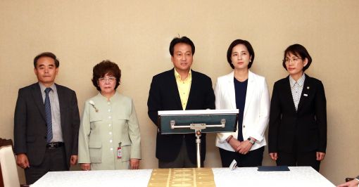 집단휴업을 예고했던 사립유치원 단체인 한국유치원총연합회가 15일 오후 휴업을 전격 철회를 발표했다. 박춘란 교육부 차관(오른쪽 두번째)이 서울 세종로 정부서울청사에서 최정혜 한유총 이사장(왼쪽 세번째)과 합의한 후 국회 교문위 더불어민주당 간사인 유은혜 의원(오른쪽), 안민석 의원(왼쪽 두번째)과 손을 잡고 있다.