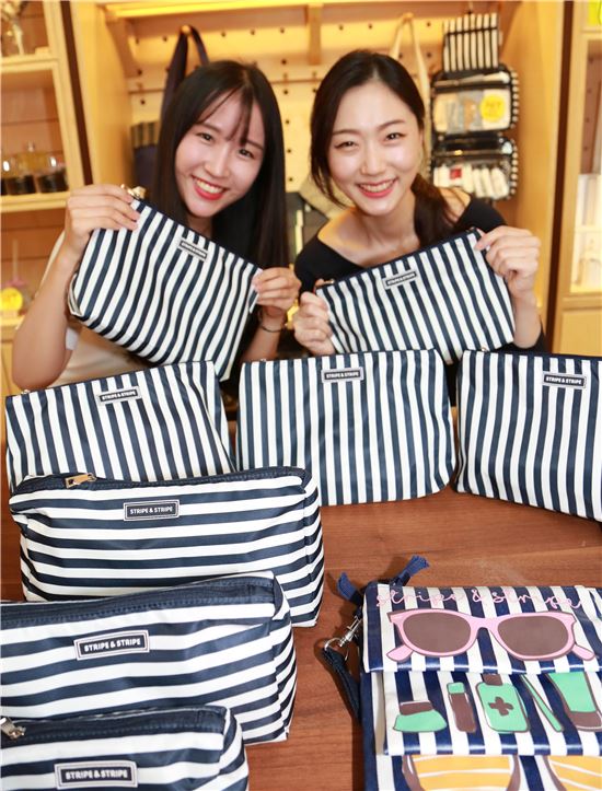 스트라이프앤스트라이프는 AK플라자가 지난해 5월 스트라이프 패턴과 라이프스타일을 결합한 콘셉트 매장으로 시즌별 클러치백, 노트북가방, 리빙 상품 등을 자체 제작해 판매하고 있다. 사은품인 ‘트래블 파우치’도 AK플라자가 자체 제작한 한정판 상품으로 일상생활 및 휴양지에서 간편하게 사용할 수 있는 스타일리시한 여행 필수 아이템이다.