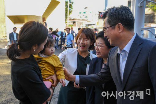 김동연(오른쪽) 경제부총리 겸 기획재정부 장관과 정현백(오른쪽 두 번째) 여성가족부 장관이 18일 오전 서울 구로구 사랑채움어린이집을 방문해 등원하는 어린이들을 맞이하고 있다.