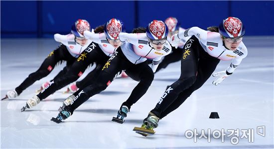 [태릉=아시아경제 김현민 기자]쇼트트랙 국가대표 선수들이 18일 서울 태릉실내스케이장에서 열린 미디어데이에서 2018 평창동계올림픽을 대비한 훈련을 하고 있다.
