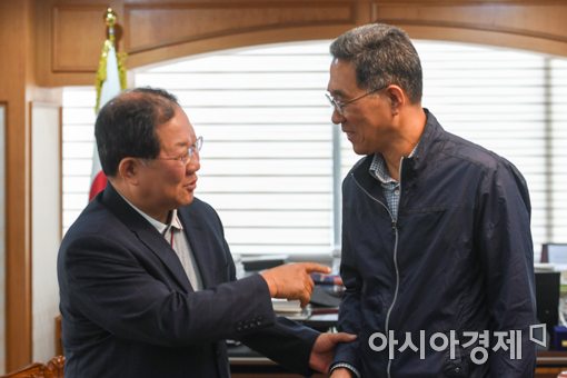 박병원(왼쪽) 한국경영자총협회 회장과 김주영 한국노총 위원장이 18일 오후 서울 마포구 경총회관에서 면담에 앞서 인사하고 있다.