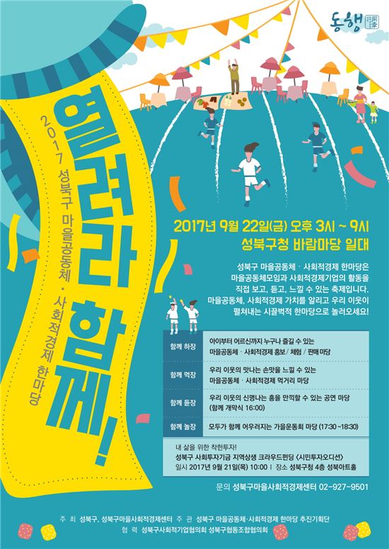 22일에는 오후 3시부터 9시까지 구청 앞 바람마당 일대에서 '2017마을공동체·사회적경제 한마당 '열려라 함께!’본행사가 개최된다.