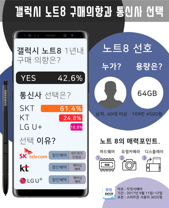 19일 설문조사 전문기업 두잇서베이가 전국 20~50대 남녀 3025명을 대상으로 조사를 실시한 결과, 전체 응답자의 42.6%가 1년 내 갤럭시노트8 구매 의향이 있다고 밝혔다.