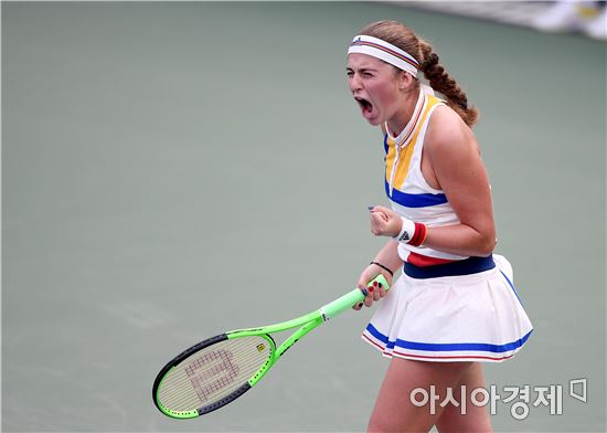 [아시아경제 김현민 기자]엘레나 오스타펜고(라트비아)가 19일 서울 송파구 올림픽공원 테니스장에서 열린 KEB하나은행 인천공항 코리아오픈 요한나 라르손(스웨덴)과의 1회전에서 환호하고 있다.