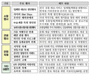 먼저, 쇼핑 부문에서는 가전, 휴대폰, 의류·패션, 화장품, 생활용품 등 소비자들이 선호할만한 다양한 할인품목을 대폭 구비하고 높은 할인율을 적용한다. 18일 기준 총 269개사가 행사 참여 등록을 마쳤고, 최종 400개사 이상이 참여할 것으로 예상된다. 특히 올해는 유통·제조업체 중심의 상품을 할인하는 동시에 엔터테인먼트·숙박·외식 등 서비스 업체의 참여를 대폭 확대해 선택의 기회를 넓혔다.