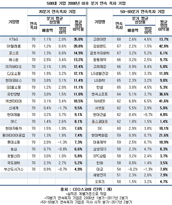 50~59분기 연속 흑자를 기록 중인 기업은 삼성SDS, 현대백화점, 한화, SPC삼립, 오뚜기 등 8개사이고, 30~49분기 연속 흑자중인 기업은 삼성전자, 기아차, 이랜드월드, 롯데제과, 아모레퍼시픽, LG하우시스, 현대글로비스, 현대엘리베이터, CJ제일제당, GS리테일, 풍산 등 34개사다.