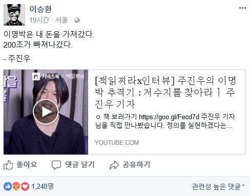 19일 오후 이승환이 자신의 페이스북에 “이명박은 내 돈을 가져갔다. 200조가 빠져나갔다 - 주진우”라는 글과 함께 동영상을 게재했다.