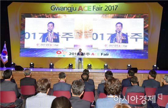 [아시아경제 노해섭 기자]윤장현 광주광역시장이 21일 오전 서구 김대중컨벤션센터 1층 다목적홀에서 열린 2017 광주 ACE FAIR(Asia Content & Entertainment Fair in Gwangju) 개막식에 참석해 인사말을 하고 있다. 오는 24일까지 나흘간 열리는 이번 행사는 38개국 440개사가 참가해 전시회, 특허사용계약 상담회, 학술행사, 특별 부대행사 등이 진행된다.