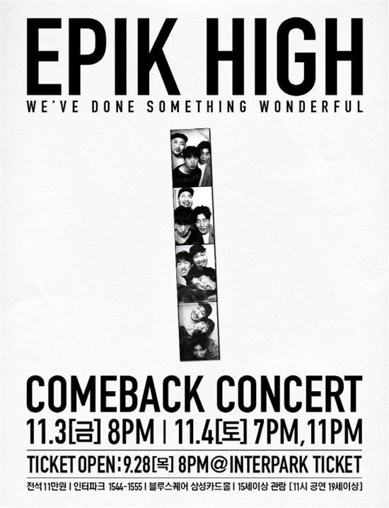 에픽하이의 컴백 콘서트는 서울 한남동 블루스퀘어 삼성카드홀에서 열리며 28일 오후 8시 인터파크를 통해 티켓 예매를 시작한다.