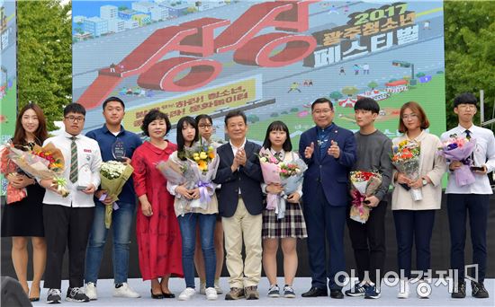 [아시아경제 노해섭 기자] 윤장현 광주광역시장이 23일 오후 동구 금남로에서 열린 '2017 광주 청소년 상상페스티벌' 기념식에 참석해 광주청소년대상 시상을 한 뒤 기념촬영을 하고 있다.