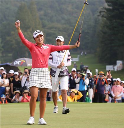 24일 경기도 양주 레이크우드골프장(파72ㆍ6628야드)에서 끝난 한국여자프로골프(KLPGA)투어 OK저축은행 박세리인비테이셔널(총상금 7억원) 최종 3라운드에서 4언더파를 보태 3타 차 우승(18언더파 198타)을 완성했다. 지난달 하이원리조트여자오픈에 이어 시즌 4승째, 우승상금 1억4000만원을 보태 10억원(9억9500만원) 돌파를 눈 앞에 두고 있다.
