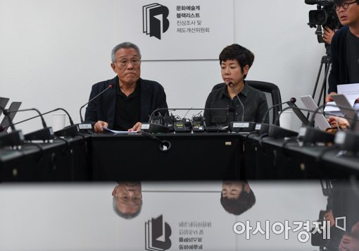 소설가 황석영과 방송인 김미화가 25일 오전 서울 종로구 광화문KT에서 문화계 블랙리스트 공개 입장 발표를 하고 있다.