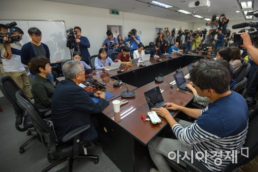 소설가 황석영과 방송인 김미화가 25일 오전 서울 종로구 광화문KT에서 문화계 블랙리스트 공개 입장 발표를 하고 있다.