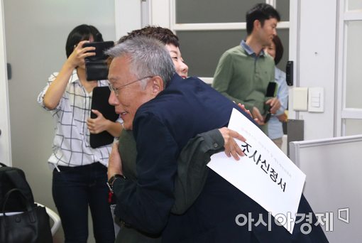 황석영 작가와 방송인 김미화가 25일 오전 서울 종로구 KT광화문 빌딩 문화예술계 블랙리스트 진상조사 및 제도개선위원회에서 국정원 블랙리스트 관련 조사 신청서를 제출하기 전 포옹하고 있다.