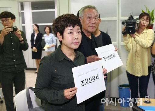황석영 작가와 방송인 김미화가 25일 오전 서울 종로구 KT광화문 빌딩 문화예술계 블랙리스트 진상조사 및 제도개선위원회에서 국정원 블랙리스트 관련 조사 신청서를 제출하기 위해 이동하고 있다.