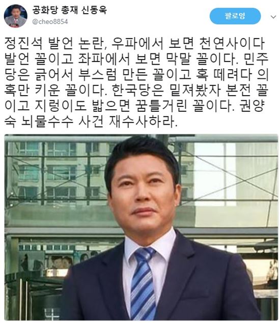 신 총재는 25일 자신의 트위터에 “정진석 발언 논란, 우파에서 보면 천연사이다 발언 꼴이고 좌파에서 보면 막말 꼴”이라며 “민주당은 긁어서 부스럼 만든 꼴이고 혹 떼려다 의혹만 키운 꼴”이라고 적었다.