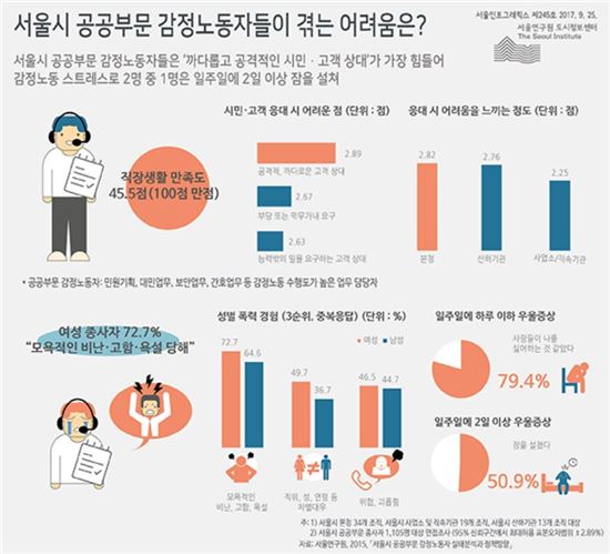 25일 서울연구원이 발표한 인포그래픽스 제245호 '서울시 공공부문 감정노동자들이 겪는 어려움은?'에 따르면 50.9%가 감정노동 스트레스로 인해 일주일에 이틀 이상 잠을 설쳤다. 감정노동으로 인한 우울증상은 '사람들이 나를 싫어하는 것 같았다'가 가장 빈번했다.