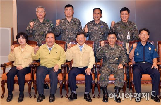 [아시아경제 노해섭 기자]윤장현 광주광역시장이 25일 오후 시청 충무시설에서 열린 '2017 화랑훈련 세미나'에 앞서 장휘국 광주시교육감을 비롯한 군·경 관계자들과 기념촬영을 하고 있다.