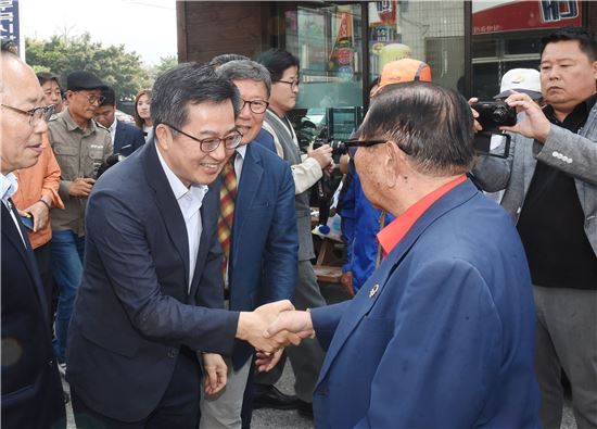 ▲김동연 부총리 겸 기획재정부 장관(왼쪽)이 25일 추석 민생안정대책 후속조치 일환으로 충북 음성군 금왕읍 소재 무극시장을 방문, 지역 어르신과 악수하며 인사를 나누고 있다. [사진 = 기획재정부]