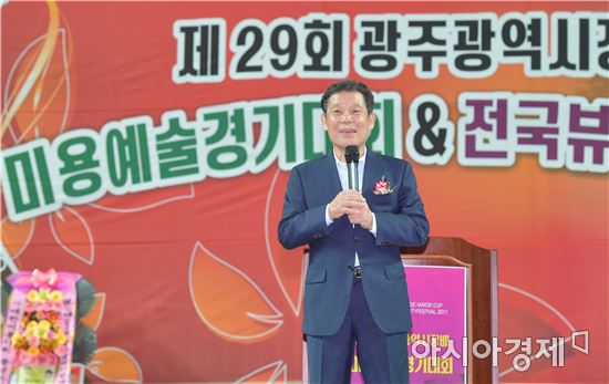 [아시아경제 노해섭 기자]윤장현 광주광역시장이 26일 오후 광산구 광주여대 유니버시아드체육관에서 열린 '제29회 광주광역시장배 미용예술경기대회'에 참석해 인사말을 하고 있다.