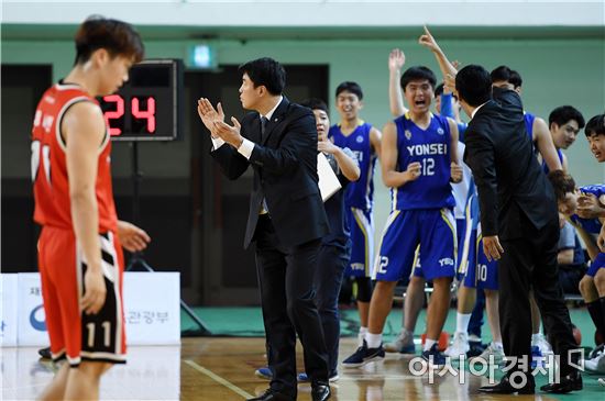 [아시아경제 김현민 기자]2017 대학 농구리그 챔피언결정전 1차전 고려대와 연세대의 경기가 26일 고려대 화정체육관에서 열렸다. 연세대 벤치의 선수단이 3쿼터 점수차가 벌어지자 환호하고 있다.