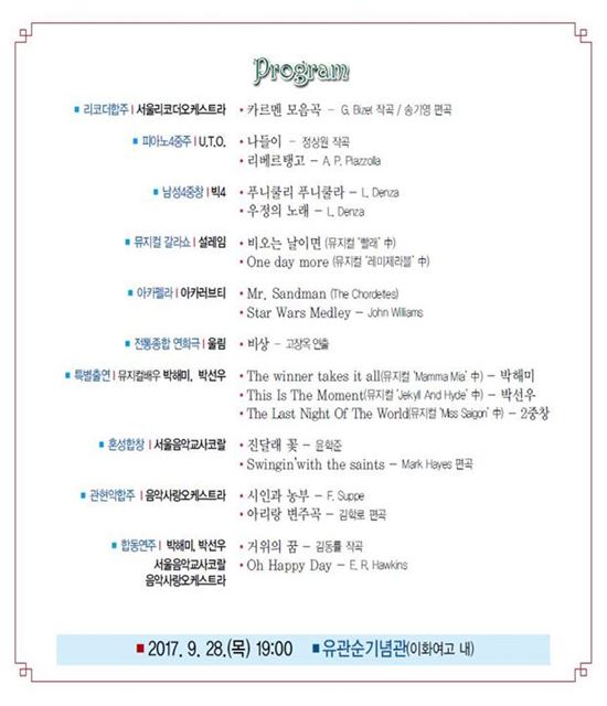 서울교육청 관계자는 "공연에 참가하는 연주자들은 전문성 발현하며 충전의 기회를 갖고 공연을 관람하는 교원들과 가족들은 소중한 추억을 갖게 될 것"이라고 말했다.