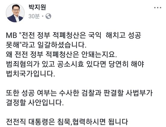 이어 “또한 성공 여부는 수사한 검찰과 판결할 사법부가 결정할 사안입니다”라며 “전 전직 대통령은 침묵, 협력하시면 됩니다”라고 덧붙였다.