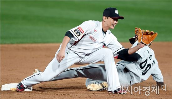 [수원=아시아경제 김현민 기자]프로야구 두산 베어스와 kt 위즈의 2017 KBO리그 경기가 28일 수원 kt위즈파크에서 열렸다. 4회초 무사 1루에서 LG 강승호의 번트 때 1루주자 백승현이 2루에서 아웃되고 있다. kt 유격수는 박기혁.