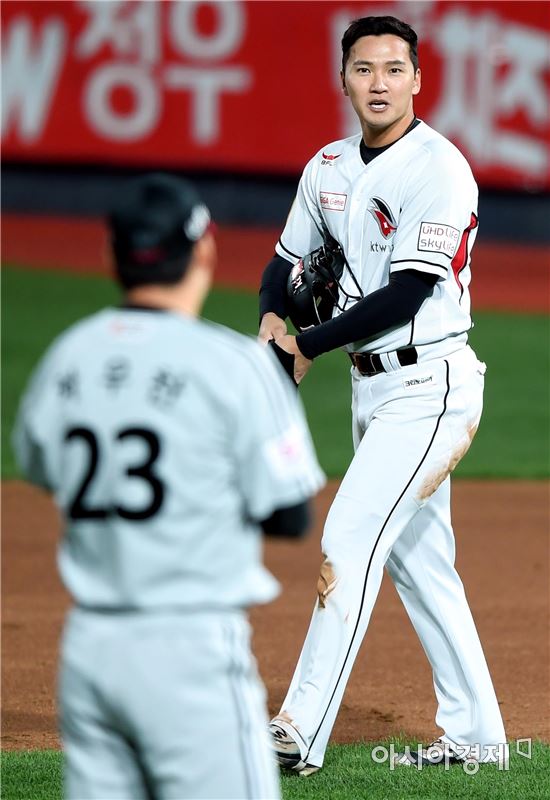 [수원=아시아경제 김현민 기자]프로야구 두산 베어스와 kt 위즈의 2017 KBO리그 경기가 28일 수원 kt위즈파크에서 열렸다. 5회말 무사 2루에서 kt 김동욱이 1타점 2루타를 치고 비디오 판독을 기다리는 중 LG 차우찬과 대화하고 있다.