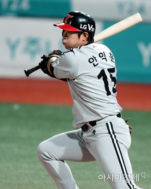 [수원=아시아경제 김현민 기자]프로야구 두산 베어스와 kt 위즈의 2017 KBO리그 경기가 28일 수원 kt위즈파크에서 열렸다. 8회초 무사 1루에서 LG 안익훈이 중전 안타를 치고 있다.