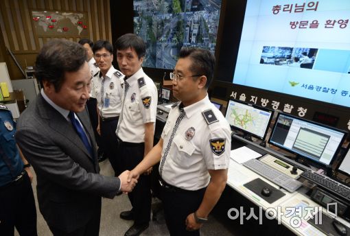 [아시아경제 문호남 기자] 추석 연휴를 하루 앞둔 29일 이낙연 국무총리가 서울 종로구 서울지방경찰청 내 종합교통정보센터를 방문해 근무자들을 격려하고 있다.