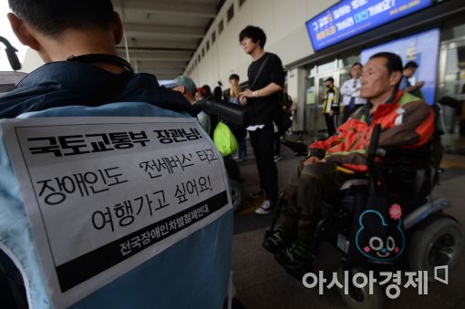 [아시아경제 문호남 기자] 전국장애인차별철폐연대 관계자들이 29일 서울 서초구 서울고속버스터미널에서 '장애인 이동권 보장을 위한 추석연휴 천막농성 돌입 기자회견'을 마친 뒤 김현미 국토교통부 장관과 면담을 촉구하고 있다.
