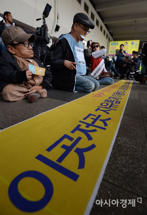 [아시아경제 문호남 기자] 전국장애인차별철폐연대 관계자들이 29일 서울 서초구 서울고속버스터미널에서 '장애인 이동권 보장을 위한 추석연휴 천막농성 돌입 기자회견'을 마친 뒤 김현미 국토교통부 장관과 면담을 촉구하고 있다.