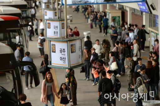 [아시아경제 문호남 기자] 추석 연휴를 하루 앞둔 29일 서울 서초구 서울고속버스터미널에서 귀성객들이 버스에 탑승하기 위해 대기하고 있다.