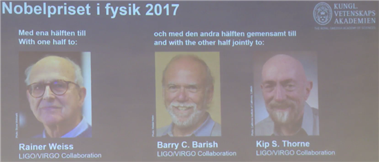 스웨덴 왕립 과학 아카데미(The Royal Swedish Academy of Sciences)는 3일 오후 '중력파가 마침내 발견됐다'는 평가와 함께 라이너 바이스 MIT, 배리 배리시 캘리포니아공대, 킵 손 캘리포니아공대 교수를 '2017 노벨물리학상' 공동 수상자로 선정했다.