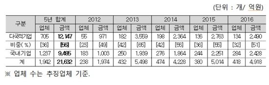 특히 연도별로 추징된 전체 탈루세액 중 다국적기업에 추징된 탈루세액 규모가 차지하는 비중은 ▲2012년 49% ▲2013년 65% ▲2014년 56% ▲2015년 55% ▲2016년 51% 등으로 해마다 절반 이상을 차지한 것으로 확인된다.