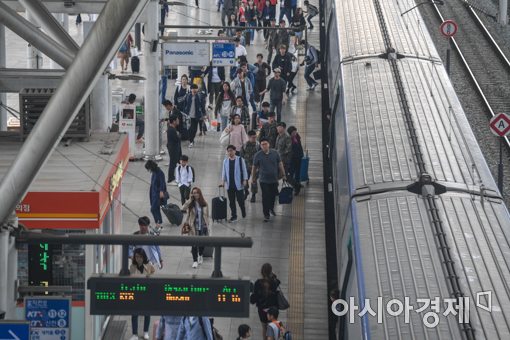 추석 연휴 막바지인 8일 오전 서울역에서 귀경객들이 기차에 내려 이동하고 있다.