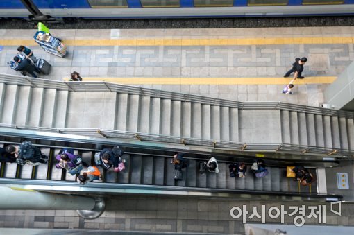 추석 연휴 막바지인 8일 오전 서울역에서 귀경객들이 기차에 내려 이동하고 있다.