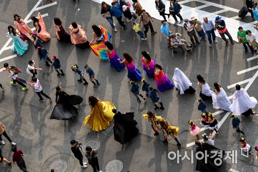 추석 연휴 막바지인 8일 오후 서울 세종로 일대에서 열린 '서울거리예술축제 2017'에서 퍼레이드가 펼쳐지고 있다.