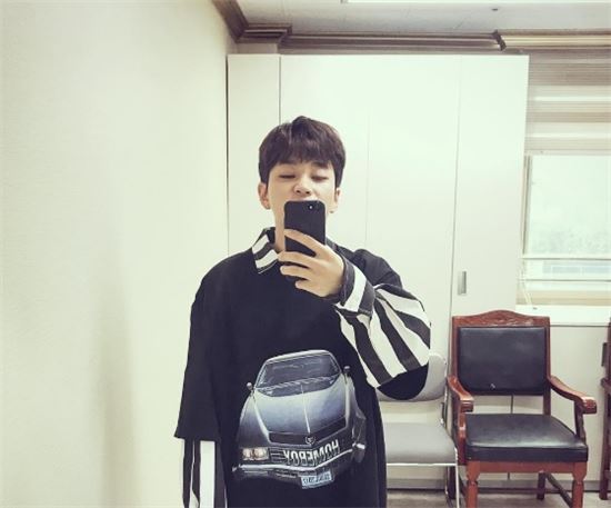 사진 속 딘딘은 귀여운 표정을 지으며 거울 셀카를 찍고 있다. 딘딘의 독특한 티셔츠가 눈길을 끈다.